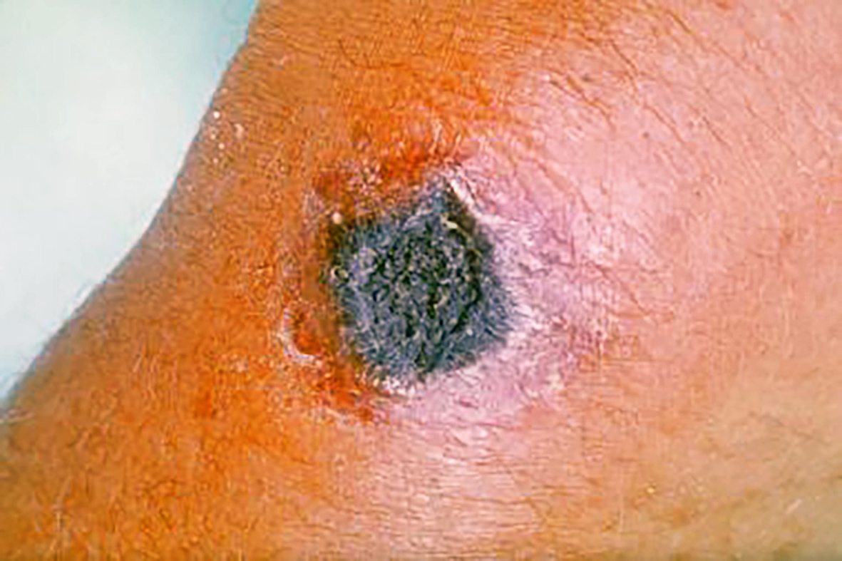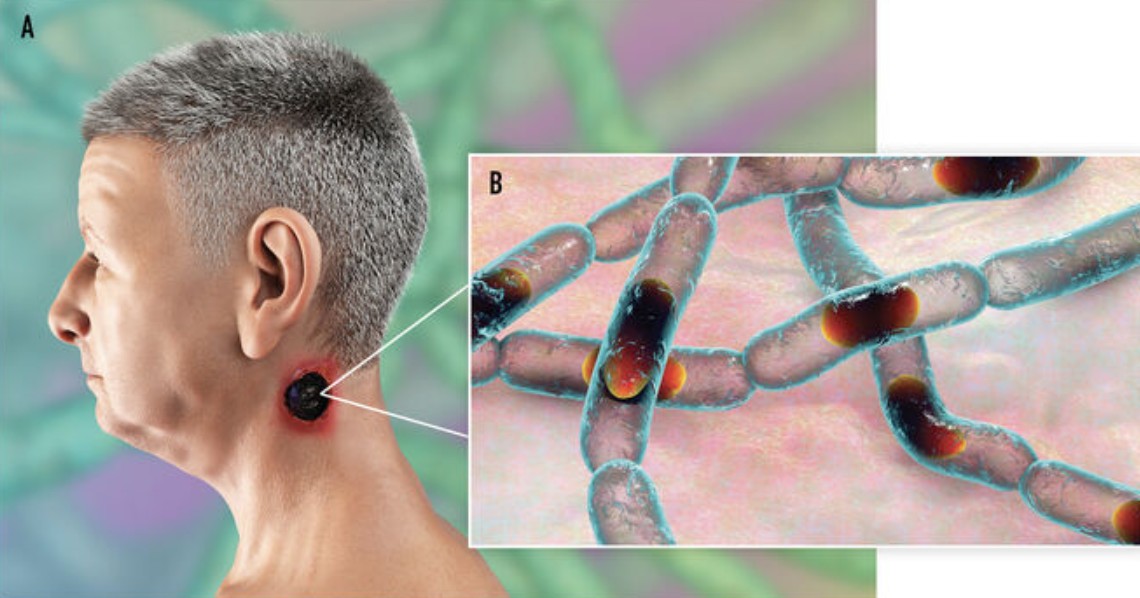 Tvær tölvugerðar myndir frá Shutterstock sem sýna A: dæmigert sár af völdum miltisbrands og B: byggingu bakteríunnar sem getur geymst von úr viti.