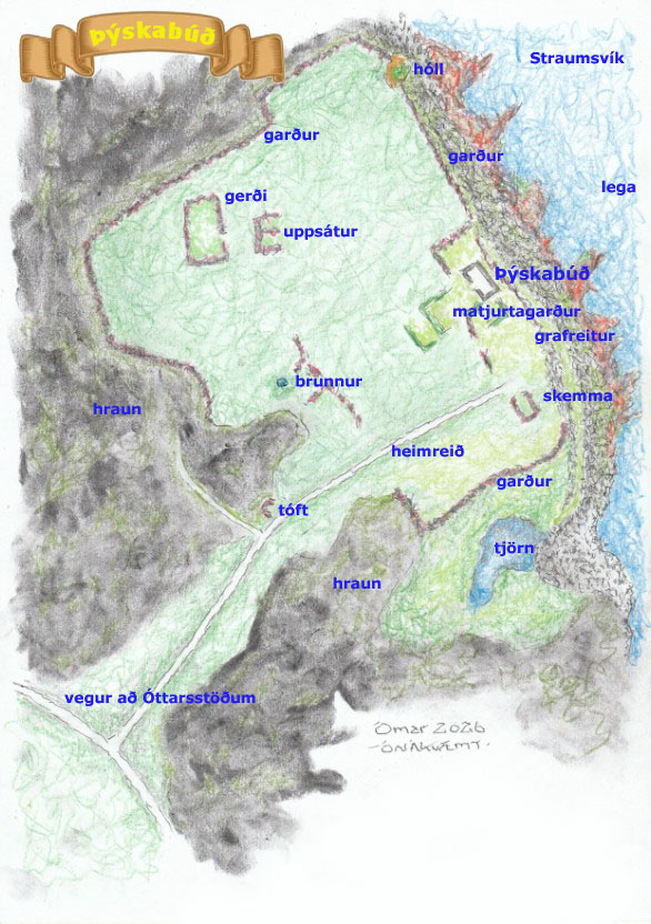 Ísólfsskáli – túnakort 1918 sett yfir nýlega loftmynd. Gamli brunnurinn er kominn undir kampinn. ÓSÁ