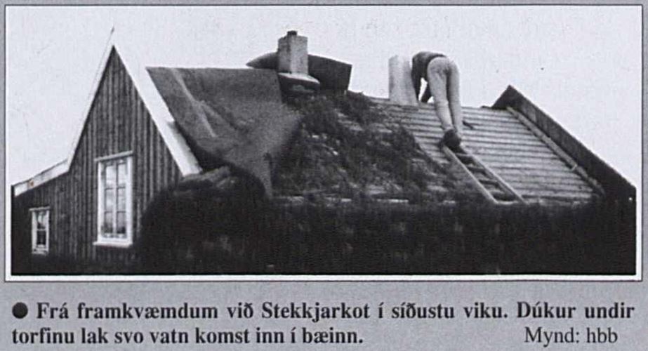 „Mest allt torf og dúkur var rifinn af þaki torfbæjarins Stekkjarkots í Njarðvík í síðustu viku vegna leka. Að sögn Kristjáns Pálssonar, bæjarstjóra í Njarðvík, lak þakið á nokkrum stöðum á milli gangs og baðstofu. Dúkur er undir torfinu er hann virðist hafa lekið á nokkrum stöðum. Það var því ráðlegt að skipta um hann strax, frekar en að geyma verkið fram á næsta vor.“