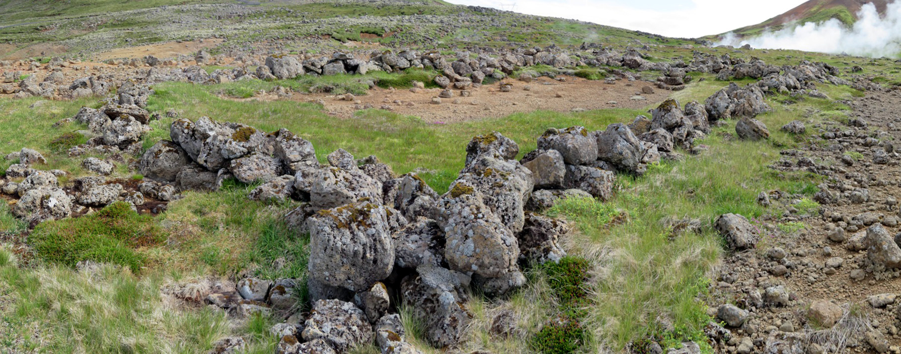 Gengið var upp á Bæjarfell og skoðaðar einstakar jarðmyndanir, en í viðræðum við Jón Jónsson, jarðfræðing, á heimili hans fyrir skömmu sýndi hann hvar þær var að finna. Norðan undir Bæjarfelli, skammt vestan varnargarðs, má sjá tótt af húsi.