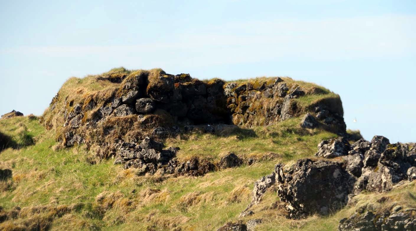 8.8.1979: „Efst og austast í hólmanum rakst ég þá á hleðslu úr grjóti, sem hverfur inn undir hraunið. Við nánari athugun kom í ljós að þarna hefur verið – sennilega – fjárbyrgi eða rétt, sem hraunið hefur runnið inn í og yfir.