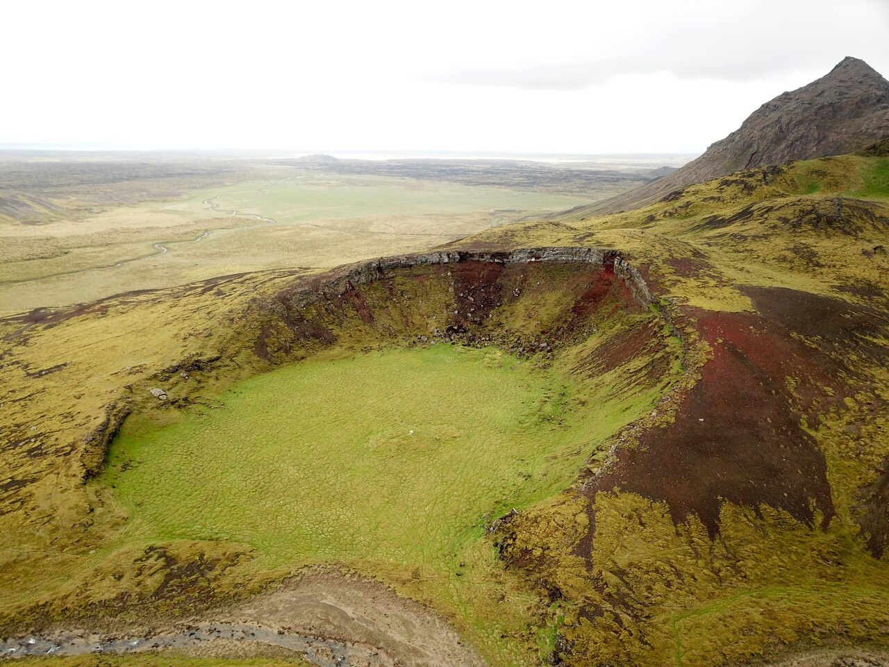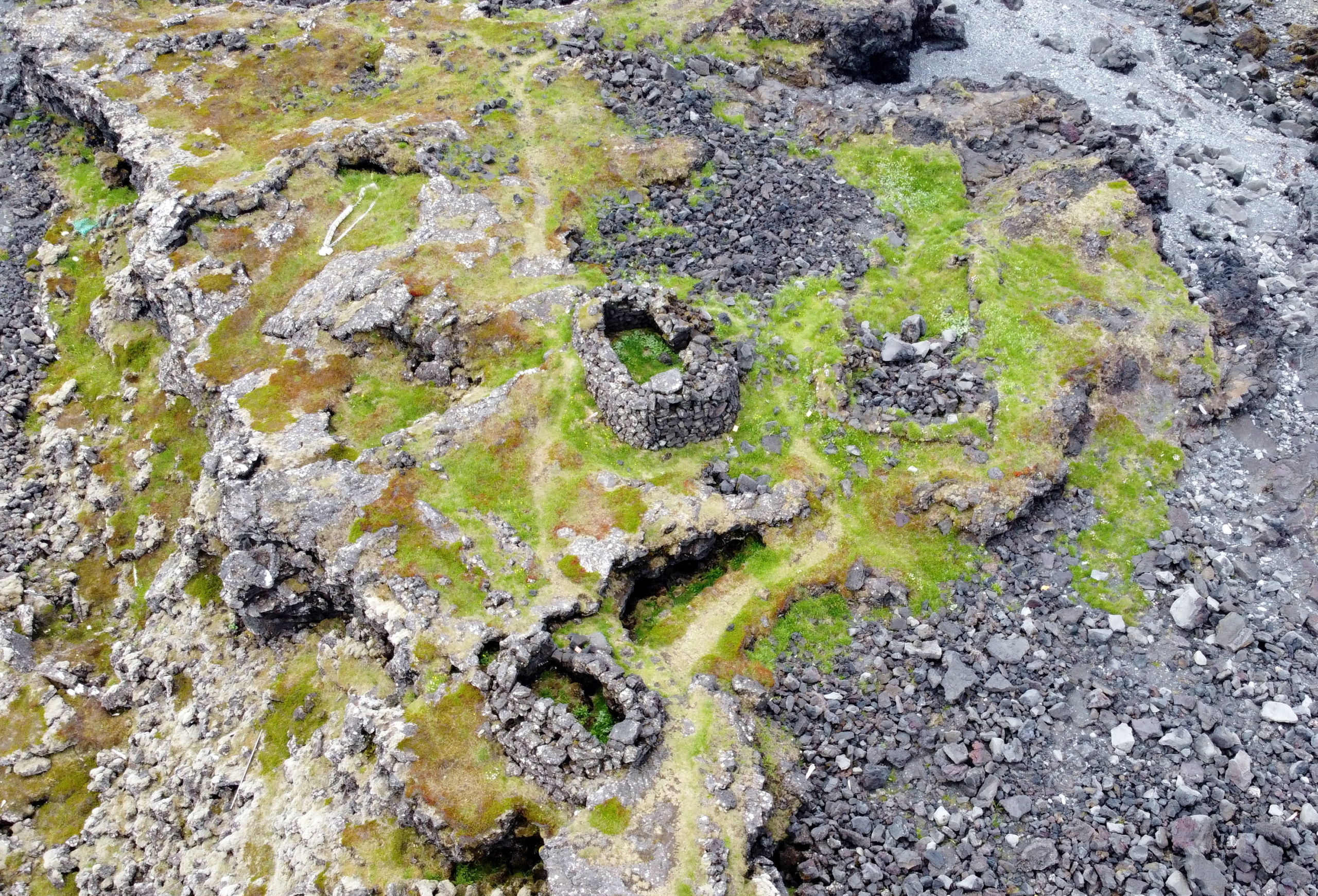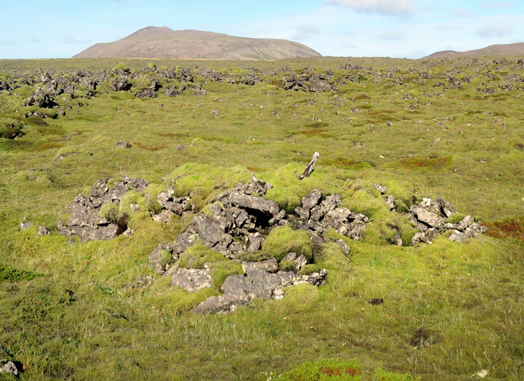Rústirnar er í kvos, þar sem hraunið hefir klofnað og sinn hraunriminn oltið fram hvorumegin, eftir flötu hrauni, sem áður hefir storknað. Sér að eins á einn veg út úr kvosinni, og á þeim stað er það, sem koma má þangað hesti, ef gætilega er farið. Við fundum 7 tóftir og var hver laus við aðra. Tvær eru afsíðis, suður með austurbrúninni, þær eru litlar og huldar mosa. Inni í kvosinni eru 3 tóftir, sem mynda röð yfirum hana þvera. Hin stærsta þeirra er við vesturbrúnina, nálægt 6 al. löng. 2 fðm. austar er önnur 5 al. löng og þá 7 fðm. austar en hin þriðja, 4 al. löng, og er hún við austurbrúnina. Allar eru þær jafnvíðar: rúml. 2 al.; þær eru bygðar af smáum hraunhellum og aðrar stærri hafa myndað þak, en eru nú fallnar ofan í. Veggirnir standa lítt haggaðir; eru gaflar hæstir og dyr á hliðinni við annan gaflinn, eins á öllum. Vindaugu eru á veggjum og göflum. Eigi snúa þær göflum saman og eigi heldur hliðum, en horfa skáhalt hver við annarri. Ekki virtust okkur þær líklegar til íbúðar, en hefðu getað verið geymsluhjallar, t.a.m. fyrir þurrkað kjöt. Í kvosarbotninum er hringmynduð tóft, svo lág, að veggirnir eru mosa huldir. Það gæti verið niður hrunin fjárrétt. En eigi bendir það þó til þess er Sæmundur [Jónsson á Járngerðarstöðum] sagði: að í henni hefði hann fundið ösku og skörung úr járni. Inn frá stærstu tótftinni er í hraunbrúninni glufa milli kletta. Sú glufa hefir verið notuð notuð fyrir tóft; hlaðið í skörð og svo reft yfir með breiðum hraunhellum. Þær eru nú fallnar ofan í og hleðslan að nokkru leyti líka. Þetta kynni helzt að hafa verið íveruhúsið. Þar er skjól gott og fylgsni gott. En ólíklegt er að menn hafi getað dvalið til lengdar á þessum stað. Þar hefir víst verið „á flestu góðu mesta óhægð“. Þar hefir ekkert verið til eldiviðar, því þá hefir mosinn ekki verið kominn.