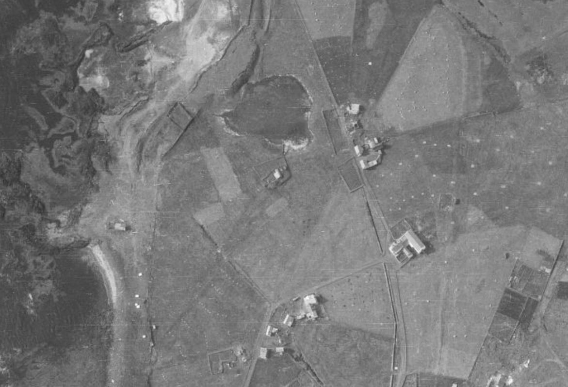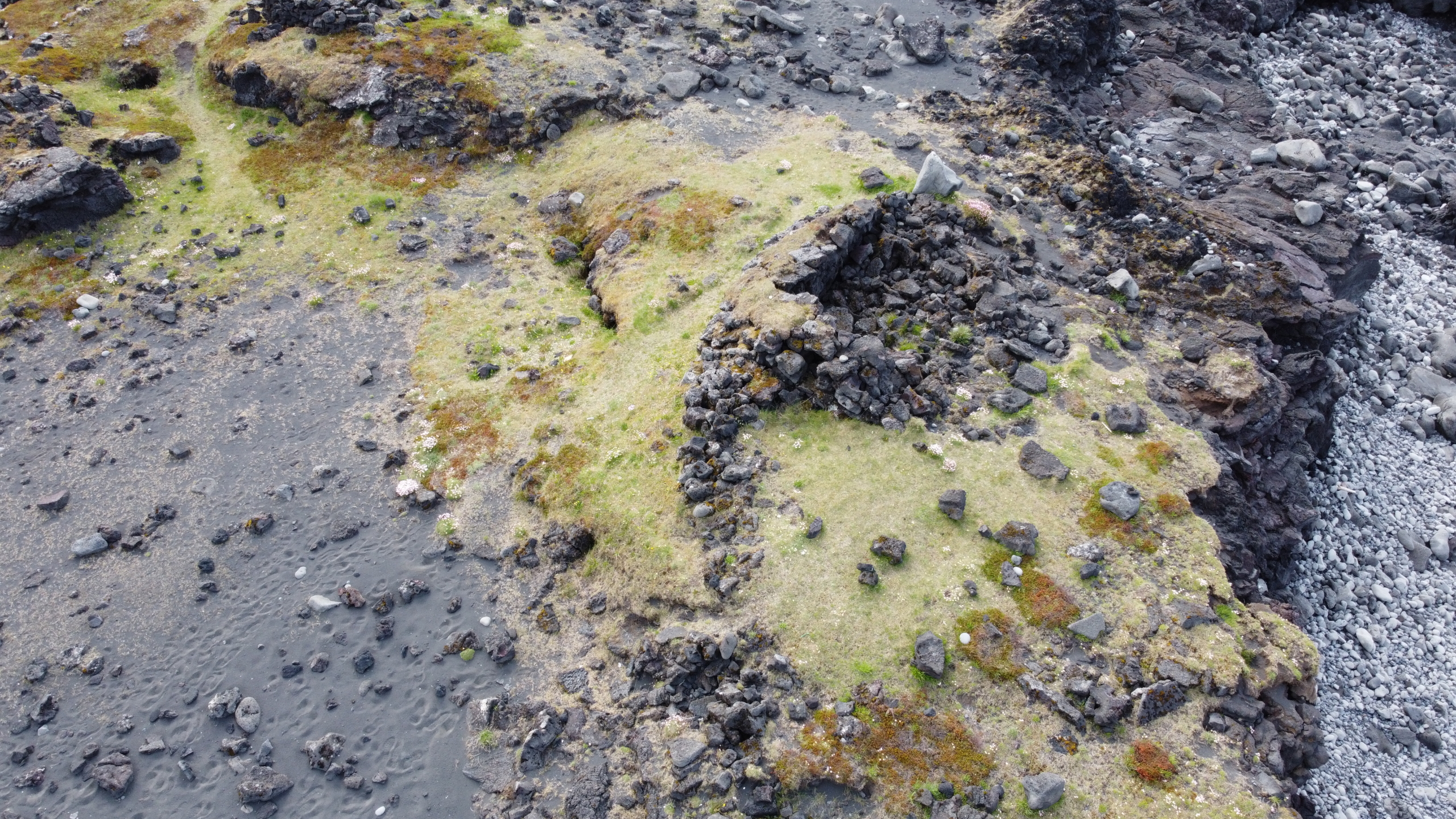 Þverhnípti klettaströnd, gróðursnautt. Engar fornleifar eru á þessum stað.