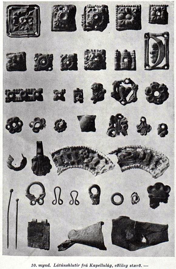 Vestur úr útsuður horni hólmans gengur graslág milli tveggja hraunjaðra. Er hún eigi breiðari en svo, að eigi má ríða 2 hestum samsíða. Þegar samt er komið vestur í hraunið, kvíslast hún í tvær lágar. Þær heita Kirkjulágar. Þar eru rústir. Verður fyrst fyrir tóft, sem snýr frá austri til vesturs, nál. 4 fðm löng og 2 fðm. breið. Dyr eru á vesturenda, jafnvíðar og tóftin sjálf. Mun þar hafa verið þil fyrir. Norðanmegin við þessa tóft, tæplega 2 fðm. frá henni, er garður, sem beygist austur fyrir hana og hverfur þar undir hraunið, en að vestan endar hann í tóftarvegg. Er sú tóft fyrir dyrum hinnar, nálægt jafnstór henni og liggur fr´anorðri til suðurs. Dyr hennar hverfa undir hraunjaðarinn að sunnanverðu. Vestan við hana dýpkar lágin að mun, en er þar ekki víðari en svari tóftarvídd. Sé það tóft, hefir þar líklega verið kjallari, en hleðslan hrunin.