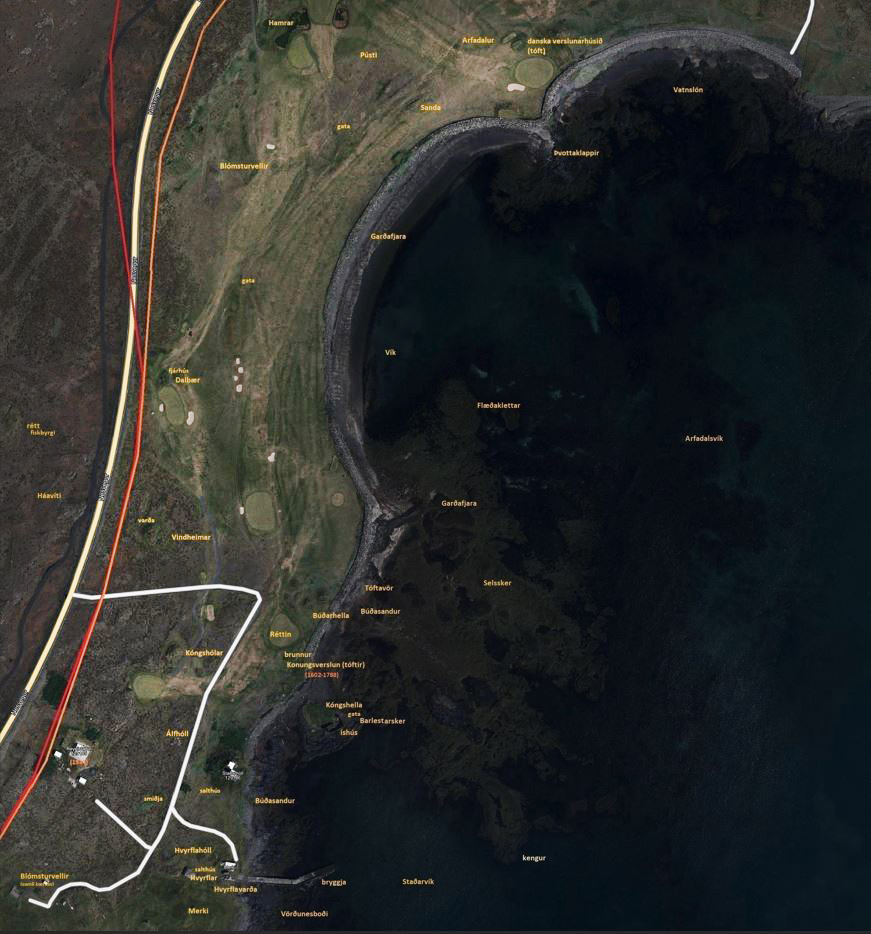 „Upp af Kóngshellu er Búðarhella. … Næstur er Búðasandur er tekur við af Garðafjöru allt frá Tóftavör, sem er vestast í Garðafjöru.“ – GB Mannlíf, 21. „Danska verzlunarhúsið stóð á litlum hól u.þ.b. 80 m upp af Tóftavör.