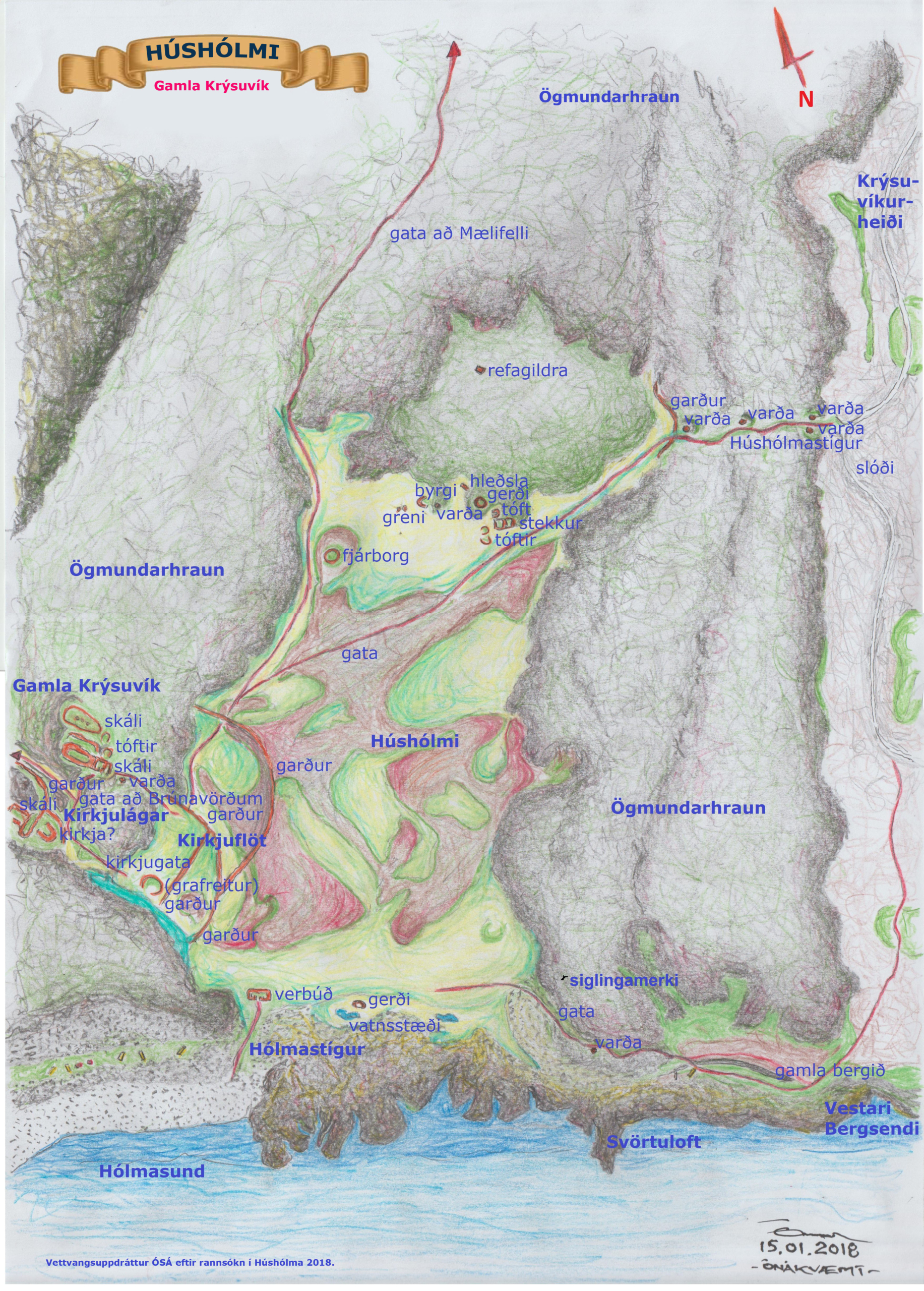 „Hraunflóð það, sem á sínum stað er nefnt Ögmundarhraun, hefir eyðilagt hinn forna bæ. Sjást þess glögg merki. … Þar undir hraunjaðrinum [við Húshólma] kemur forn túngarður, er liggur kringum allstórt svæði, en hverfur aftur í hraunið niðurfrá eigi langt frá vesturenda sjávarkambsins, sem nú var getið. Annar garður kemur undan hraunjaðrinum nokkru neðar en hinn og stenfir í suðaustur. hann beygist suður á við og gengur gegnum hinn fyrra garð skamt fyrir ofan sjávarkambinn. Er þar hlið á hinum fyrra. Svo heldur þessi síðartaldi áfram að sjávarkambinum og hverfur þar. Er þar sem gata sé rudd gegnum kambinn, líklega sjávargata, er hér eigi allbrimsamt og mun hafa verið útræði.