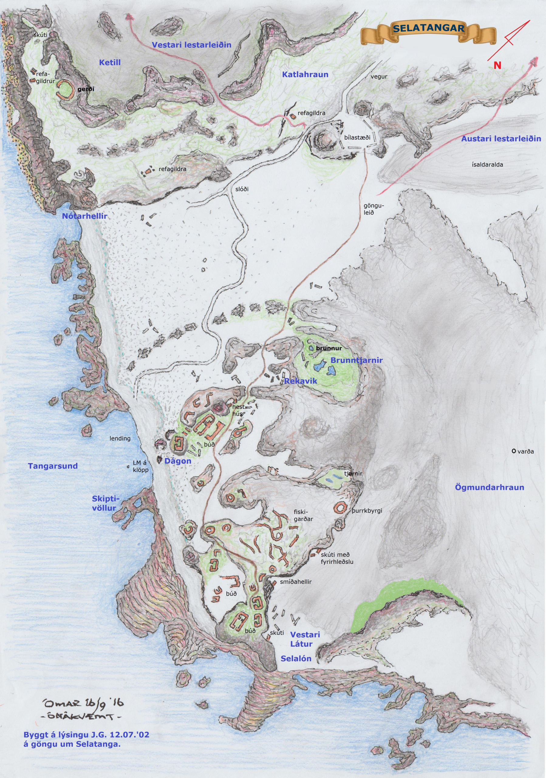 „Á Selatöngum var aldrei föst búseta, heldur einungis útver með nokkrum verbúðum. þaðan var einkum útræði Krýsuvíkurmanna, en Krýsuvík fylgdu lengi nokkrar hjáleigur. Til er gömul þula sem telur 73 menn við róðra í Krýsuvík. Ástæðan fyrir þeim kveðskap er sögð vera sú, að strákur einn hafi orðið mötustuttur í verinu. Buðust þá hásetar á skipum þeim sem þar reru að gefa honum mötu til vertíðarloka, ef hann kæmi nöfnum þeirra allra í eina þulu: Tuttugu og þrjá Jóna telja má,/ tvo Árna, Þorkel, Svein./Guðmunda fimm og Þorstein, þá/ Þorvald, Gunnlaug, Freystein. / Einara tvo, Ingimund, Rafn, / Eyvind, tvo Þórða þar. / Vilhjálmur Gesti verður jafn / Vernharður, tveir Bjarnar / Gissura tvo, Gísla, Runólf, / Grím, Ketil, Stíg, Egil. / Erlenda þrjá, Bernharð, Brynjólf, / Björn og Hildibrand til. / Magnúsar tveir og Markús snar / með þeim hannes, tveir Sigurðar. / Loftur, Hallvarður, Hálfdán, senn / þar sezt hann Narfa hjá. / Á Selatöngum sjóróðramenn / sjálfur Guð annist þá.