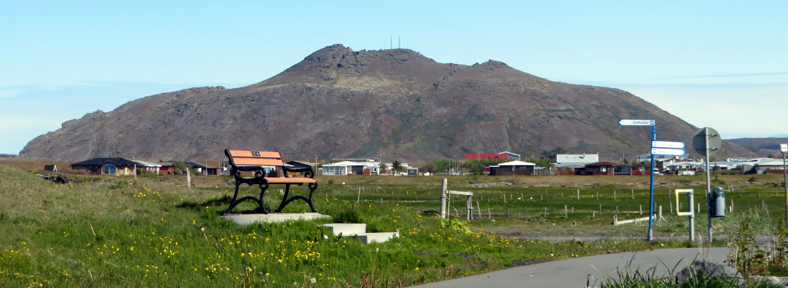 „Þessi bekkur er gefinn til minningar um systkynin Möggu, Todda, Dóru, Lauga og Gerðu frá Járngerðarstöðum„.