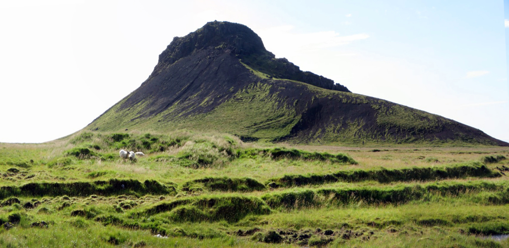 Krýsuvíkurkirkja á 18 öld – sett inn í ljósmynd frá árinu 2025.
