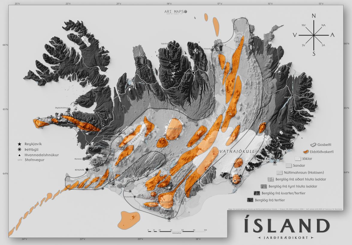 Sé Ísland skoðað í heild hafa samtals komið upp 369 km3 basalts í 457 hraungosum á nútíma, eða eftir hvarf Ísaldarjökulsins fyrir um 11.000 árum. Eru þessi 457 gos rúmlega 90% þeirra 501 hraungosa sem samtals hafa komið upp á Íslandi á nútíma en 56 þeirra hafa orðið eftir landnám. Komu 111 km3 (30%) upp á síðustu 5.000 árum, eða að meðaltali um 22,2 km3 á hverju árþúsundi, og um 188 km3 fyrir 5.000 til 10.000 árum, eða að meðaltali 37,6 km3 á hverju árþúsundi. Dreifðust rúmmálin nokkuð jafnt á hvort tímabil fyrir sig en þó var mjög lítil eldvirkni á tímabilinu fyrir um 2.000 til 3.000 árum síðan.