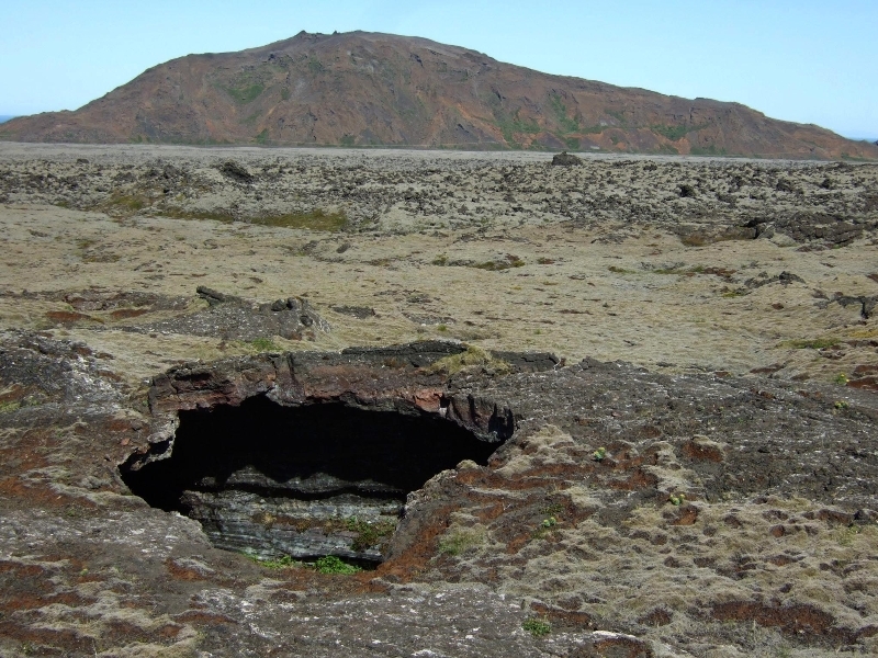 Gamli gígurinn í Hrútagjárdyngju, sem gaf af sér hina miklu kviku, sést enn, en hefur nánast fyllst af nýrra hrauni.