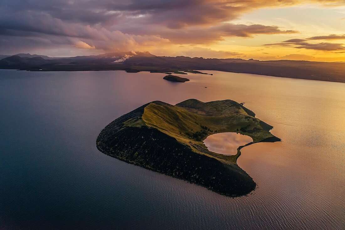 Þótt Þingvallavatn sé mesta stöðuvatn landsins, getur það ekki talizt stórt. Úr miðju vatninu rís keilulaga eyja, og líkist vatnið því mest, að það lægi á botni mikils eldgígs. Út frá því liggja djúpar og víðar sprungur í basaltklettana, en gjárbotnarnir eru huldir fagurbláu vatni. Á klettunum, sem eru eins og vígi milli gjáa, var háð Alþingi hið forna. Víðsvegar kring um vatnið standa reykjarstrókar upp í loftið, andgufa sjóðheitra vatnshvera.“…