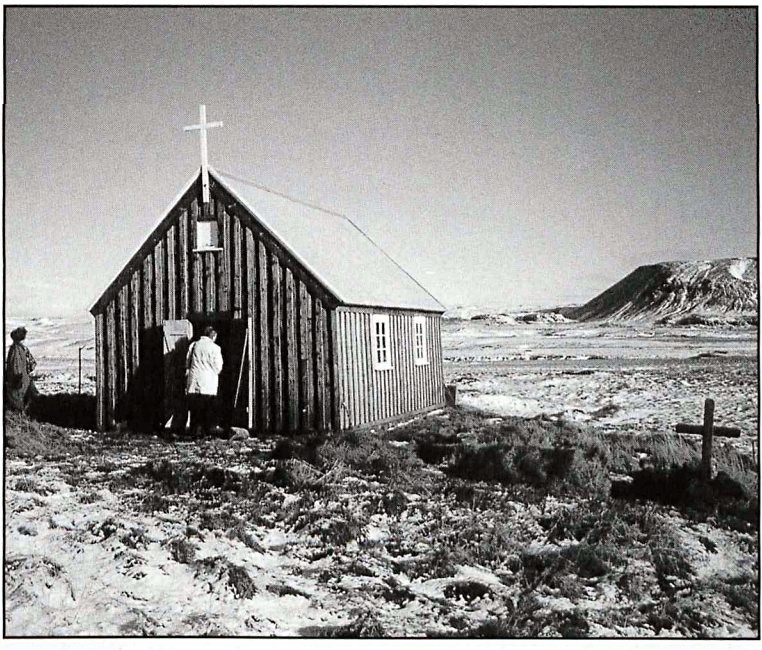 Hefur bárujárn síðan verið ysta byrði súðarinnar utan og 1901 voru svo veggir og gaflar járnklæddir. Enda þótt járnklæðning gömlu trékirknanna þyki nú ljót og hafi víða verið rifin af, er hitt ómótmælanlegt, að mikil vörn var í, ekki sízt í byggðum, sem eru svo opnar fyrir allri sunnanátt og stórrigningum af hafi sem Suðurkjálkinn. Fá ár eru síðan bárujárnið var rifið af Krýsuvíkurkirkju og húsið standklætt af nýju eins og sér á meðfylgjandi mynd, sem tekin var á veturnóttum 1998, nema þakið sem skiljanlegt er.