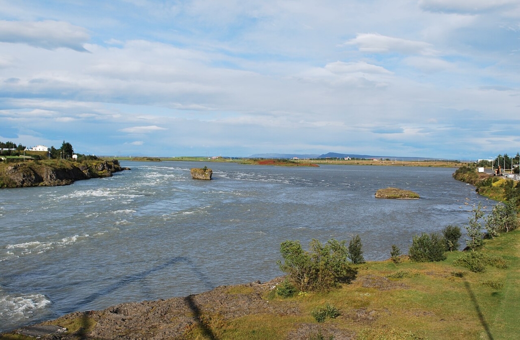 „Á öldum áður var hér einn af þremur ferjustöðum yfir Ölfusá. Ferjumaður á báti ferjaði ferðalanga, á austur- eða vesturleið yfir ána, ásamt farangri þeirra og varningi. Hestar syntu hins vegar yfir ána, sem var erfitt, og stundum hættulegt, einkum að vetrarlagi. Þetta þótti ekki sérlega erfið leið að róa fyrir vana menn, en fjarlægðin milli bakka er um 130 metrar. Lendingarstaðurinn á hinum bakkanum var skammt ofan við lítinn klett sem sjá má í ánni. Þegar Ölfurárbrú hin fyrri var byggð árið 1891, við hlið núverandi brúarstæðis neðar á ánni, lagðist Laugardælaferjan af. Laugardælaferja var nefnd eftir bænum Laugardælum hinum megin árinnar.“