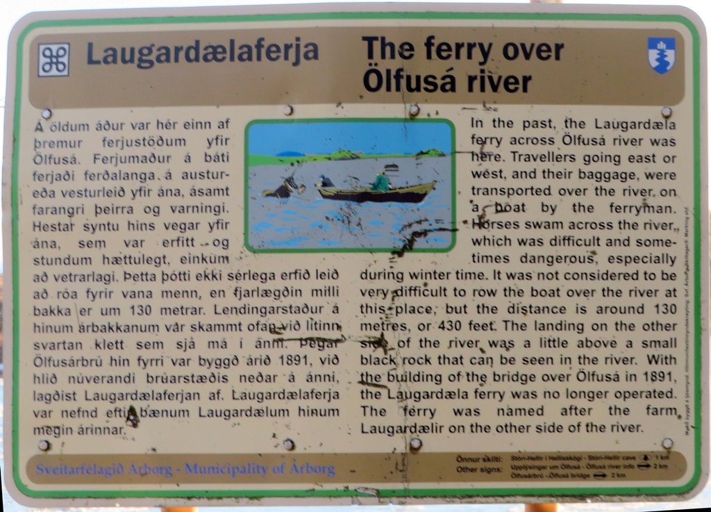 Á vestari bakka Ölfusár, við veginn að Hellisskógi, er skilti með yfirskriftina „Laugardælaferja„. Á því má lesa eftirfarandi fróðleik: