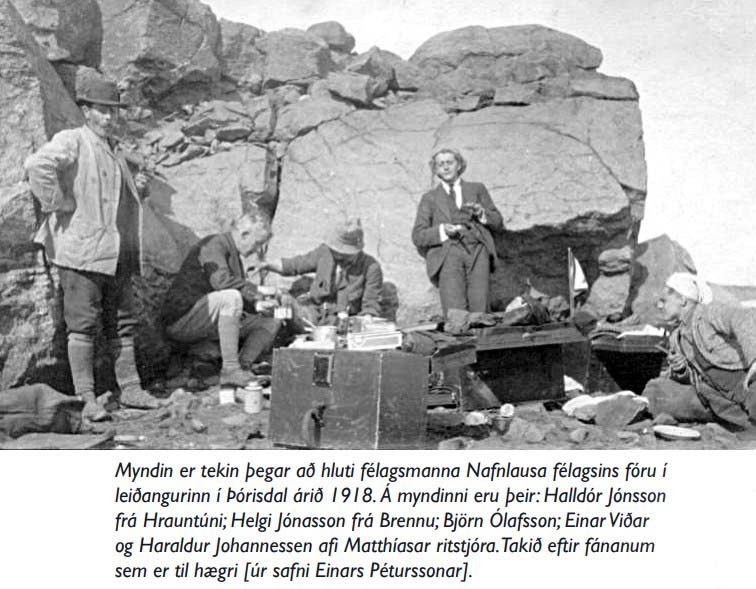 „Upp úr fyrsta áratug 20. aldar var til félagsskapur sem gekk undir nafninu „Nafnlausa fjelagið“. Nafnlausa fjelagið er undanfari Ferðafélags Íslands (FÍ) og gaf afrakstur starfsemi sinnar til byggingar sæluhússins í Hvítárnesi þegar félagið var lagt niður og sameinað FÍ. Stofnendur Nafnlausa fjelagsins voru nokkrir ungir menn í Reykjavík sem áttu það sameiginlegt að hafa mikinn áhuga á útilegum og ferðalögum þeim tengdum. Allt frá æsku vissi ég að hann afi minn, Einar Pétursson (1892-1961), hafði verið meðlimur í þessu félagi en vissi ekkert sérstaklega mikið um hvað félagið hafði á stefnuskrá sinni nema að tilgangurinn var að kanna fáfarnar slóðir á Íslandi og hálendisferðir voru mikið áhugamál hjá þeim. Því miður, þá hef ég ekki nema nokkur minningarbrot sem tengjast þessu merka félagi.