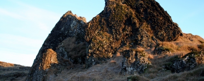 Handan melsins rís móbergsklettur allbrattur, sem fer lækkandi til austurs. Okkur finnst hann óárennilegur í fyrstu, en tökum samt stefnuna á hann og fikrum okkur upp eftir honum.