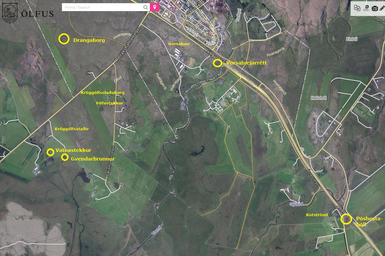 Pósthestahús á Kotstrandarhól, Vorsabæjarrétt, Drangaborg, Vatnastekkur og Gvendarbrunnur