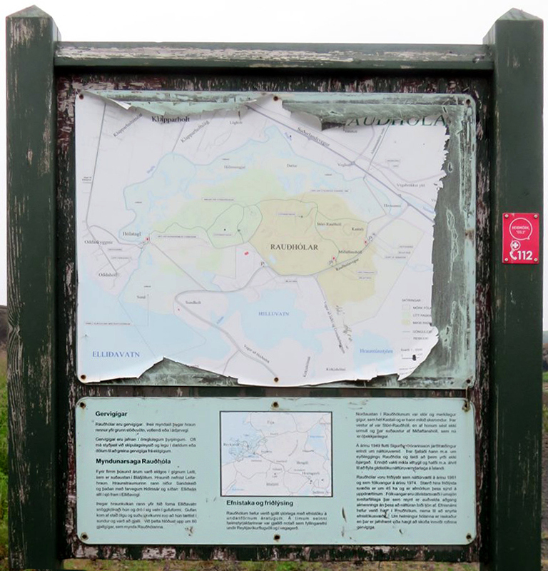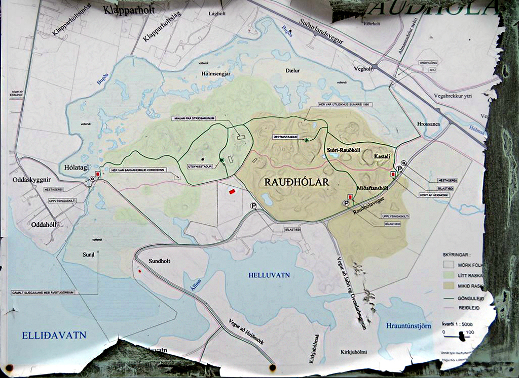 Við bifreiðastæði við Heiðmerkurveg sunnan Rauðhóla er skilti. Á því má lesa eftirfarandi: