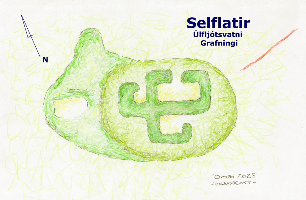 Ingvaldarsel – uppdráttur ÓSÁ. Startjörnin ofar, selsstígurinn t.h. og selshúsin og stekkurinn neðar.