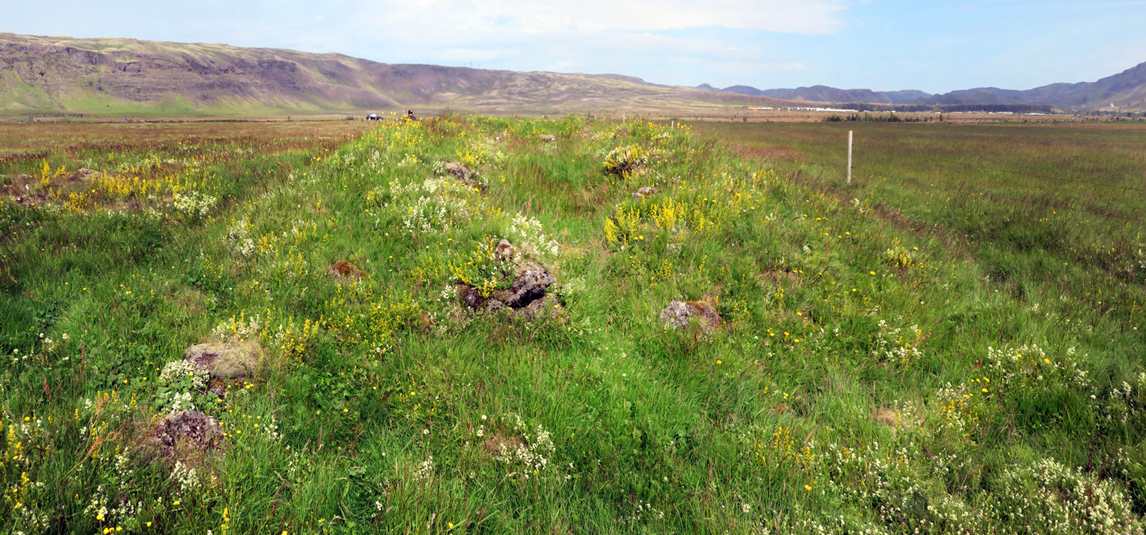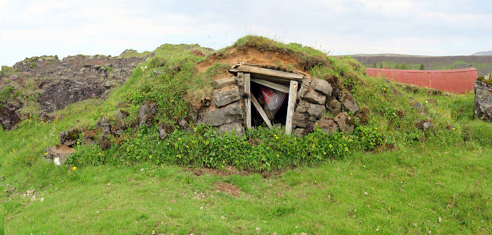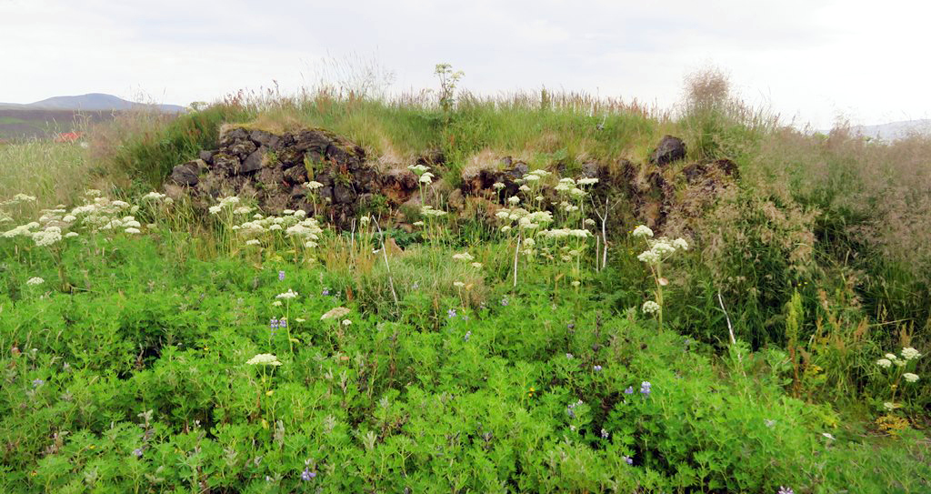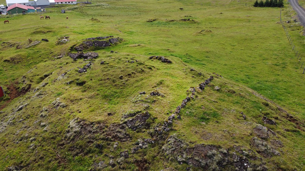 Fjárhúsin eru innan grasivaxins túns með grónum hraunhólum og klettum víða.