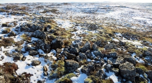 Fjárhúsin eru innan grasivaxins túns með grónum hraunhólum og klettum víða.