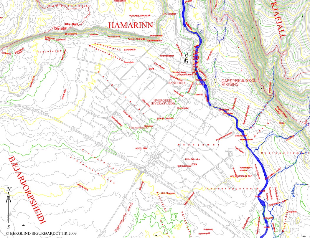 Fram úr honum rennur Varmá, en við hana hefir verið byggð rafstöð sem lýsir upp þorpið. Foss er i ánni, fagur mjög, í sjálfu Hveragerði, og er mikil bæjarprýði að honum. Undir klettahjallanum, sem að ofan er nefndur, er falleg hlíð, vaxin víði og blágresi, og mun þar verða lystigarður þorpsins innan tíðar.