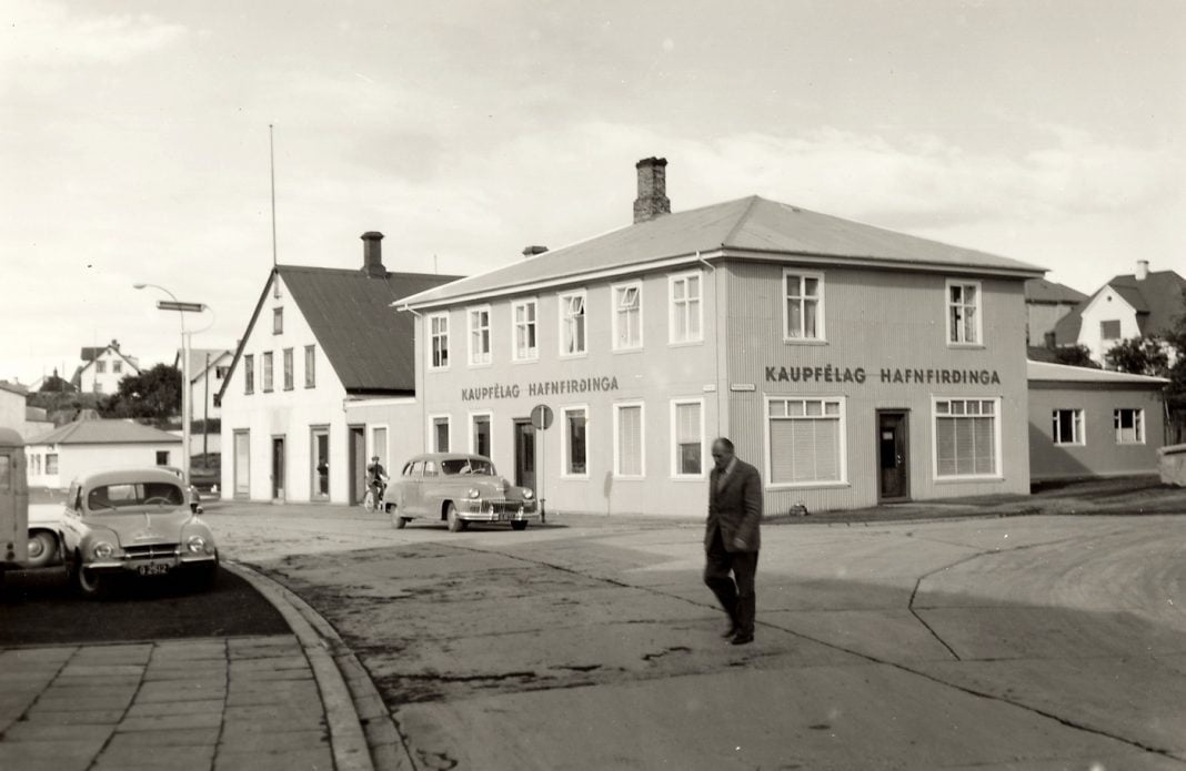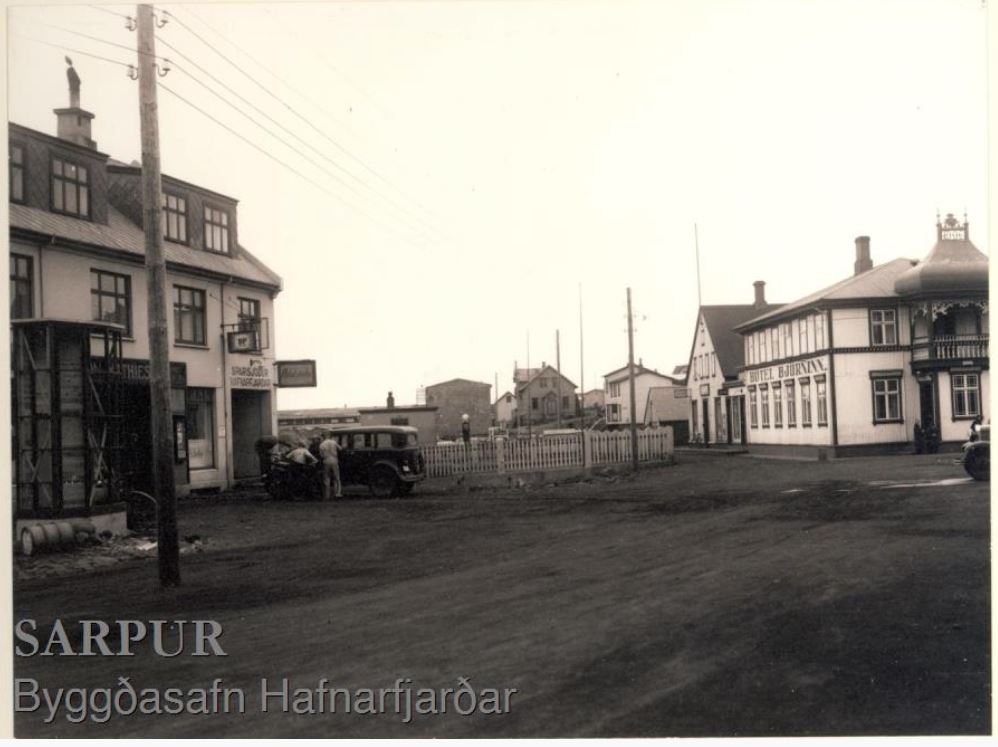 Strandgata/Vesturgata – Hótel Björninn með sínar glæsilegu yfirbyggðu svalir (1910/1970) og A.Hansen verzlunarhús fjær. Myndin sýnir hótelið og Hansenshús þar næst, Vesturgata 2 og 4. Til vinstri er verslun Jóns Mathíesens og í sama húsi er Sparisjóður Hafnarfjarðar, Strandgata 4, fyrir miðri mynd er bensín stöð, líklega BP. Í bakgrunni er Edinborgarhúsið.