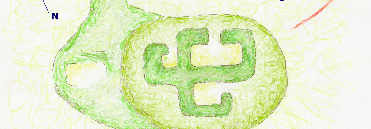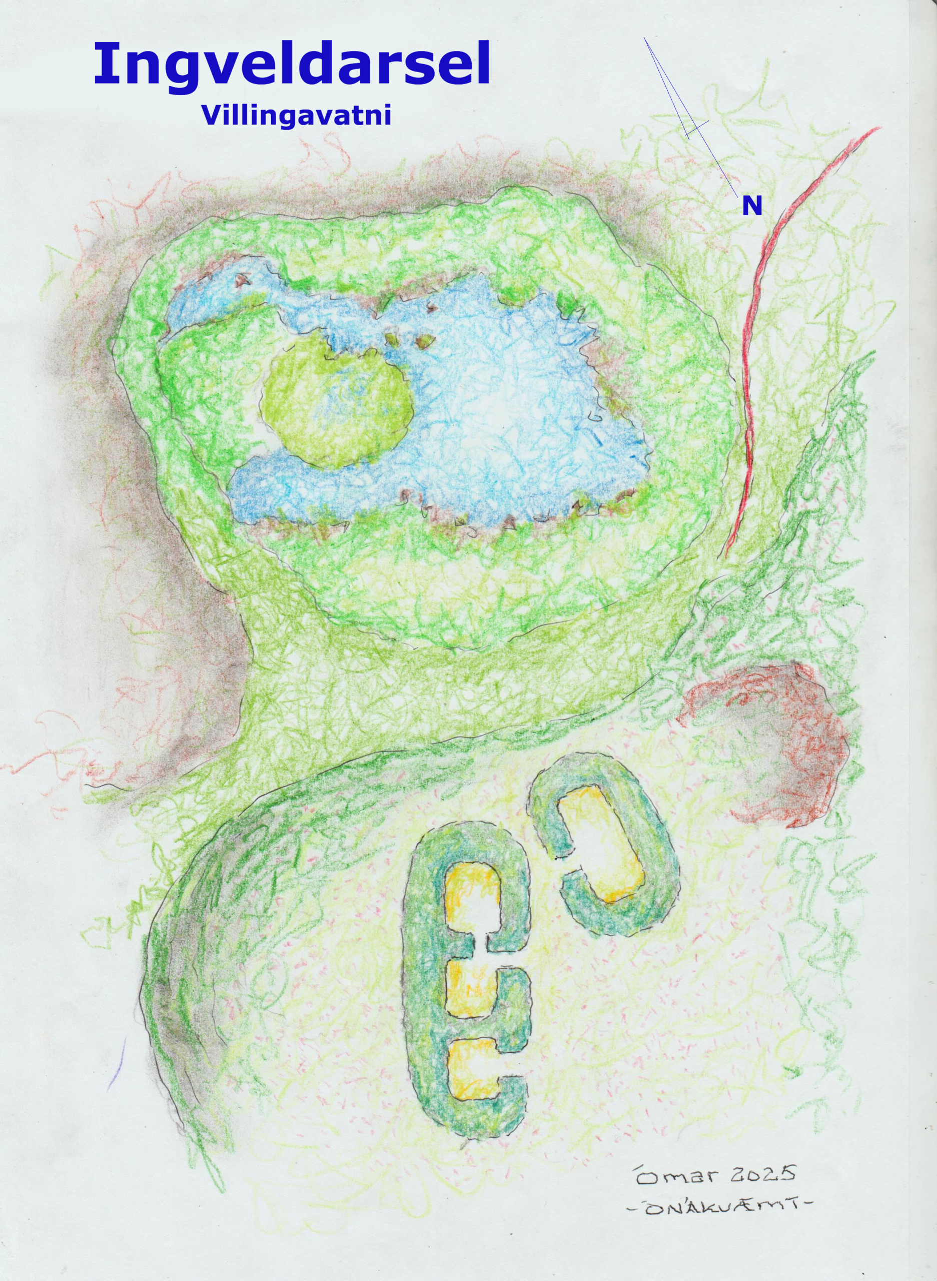 Ingvaldarsel – uppdráttur ÓSÁ. Startjörnin ofar, selsstígurinn t.h. og selshúsin og stekkurinn neðar.