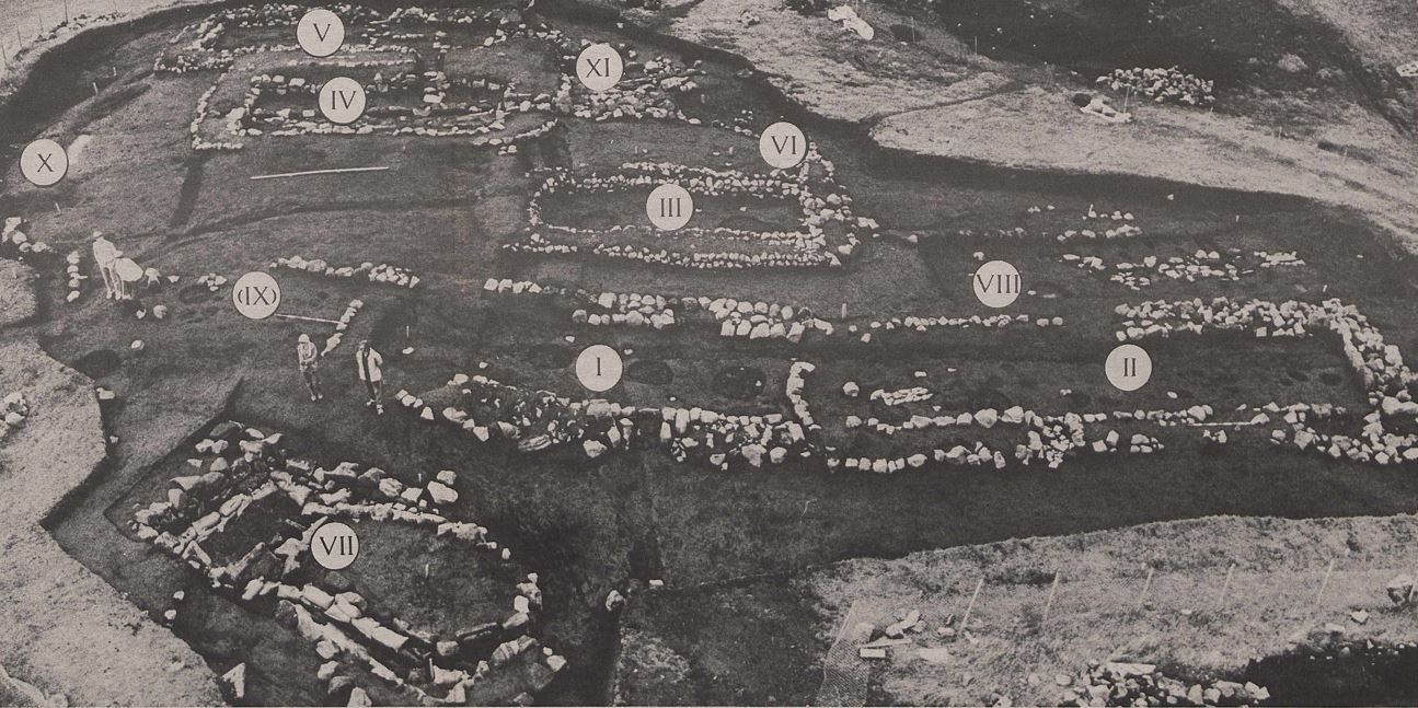 Uppgraftrarsvæðið í Herjólfsdal séð frá austri. Eftirfarandi er merkt á myndina: