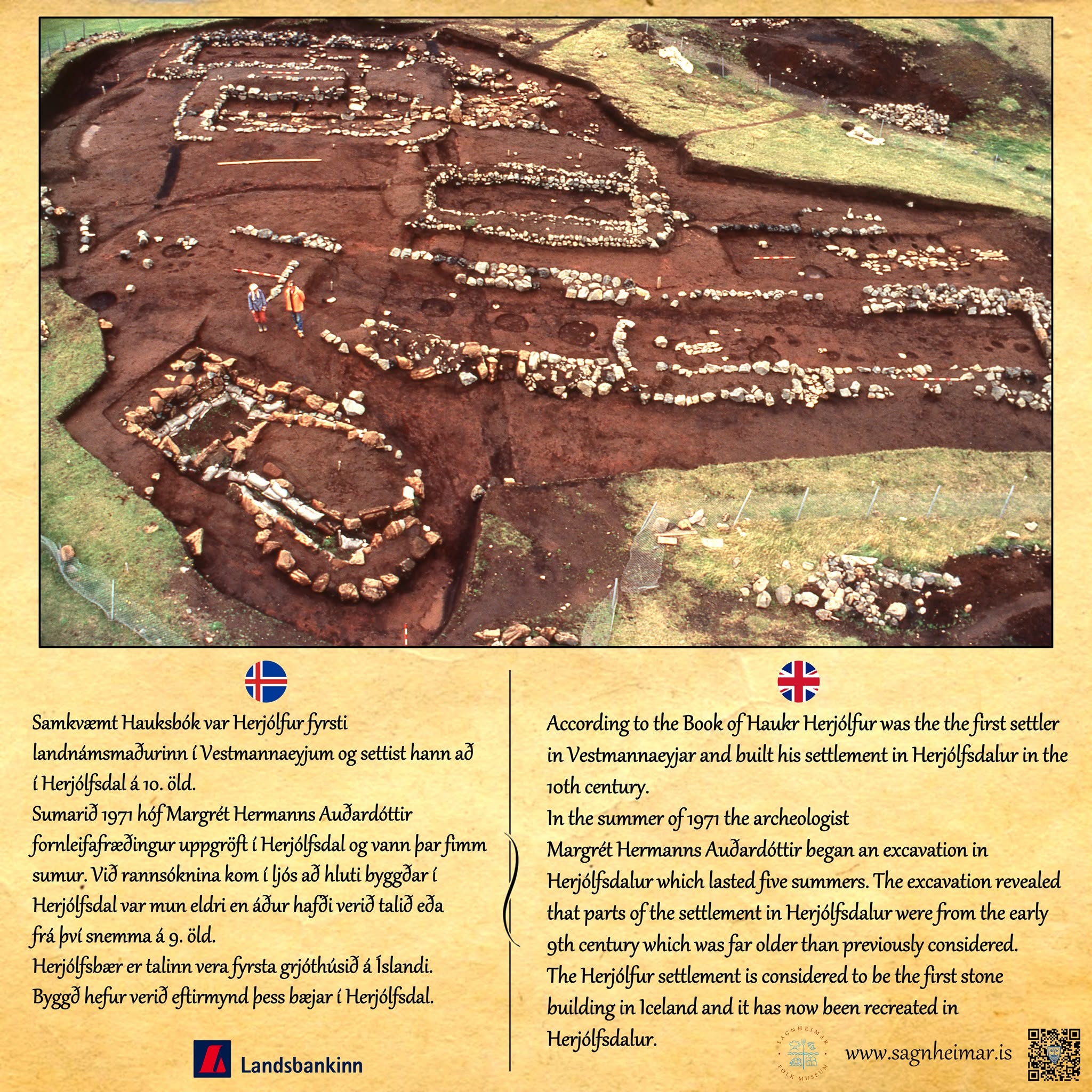 Herjólfsbær. Í októbermánuði 2005 var ráðist í byggingu nýs Herjólfsbæjar í Herjólfsdal. Að smíðinni er notast við áreiðanlegastu heimildir og reynt að gera hann sem líkastan upprunalegum bænum. Húsið er byggt sem langhús og gripahús. Lista- og menningarfélagið Herjólfsbæjarfélagið hafði frumkvæði að smíðinni. Að framkvæmdinni stóðu Árni Johnsen, Þórður Guðnason, Þorsteinn D. Rafnsson, Esra Ó. Víglundsson og Víglundur Kristjánsson.