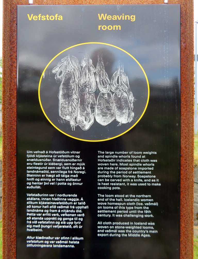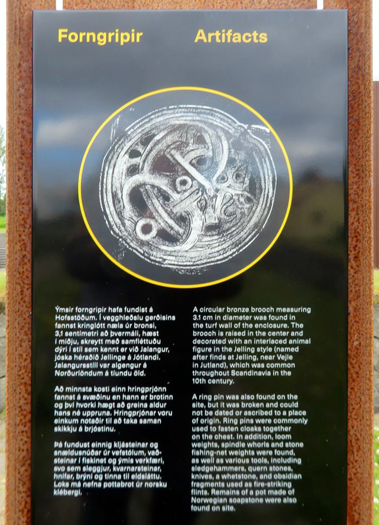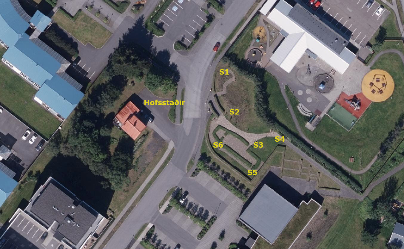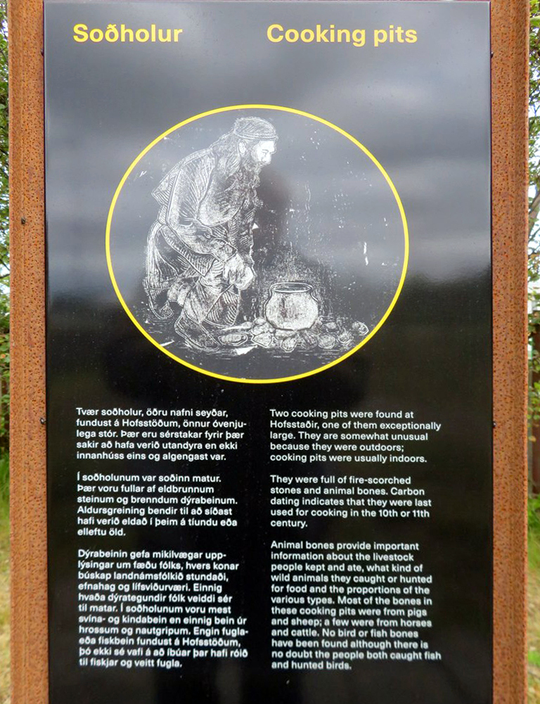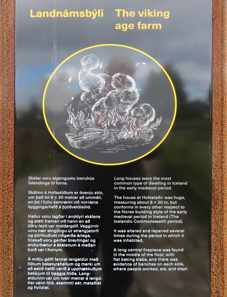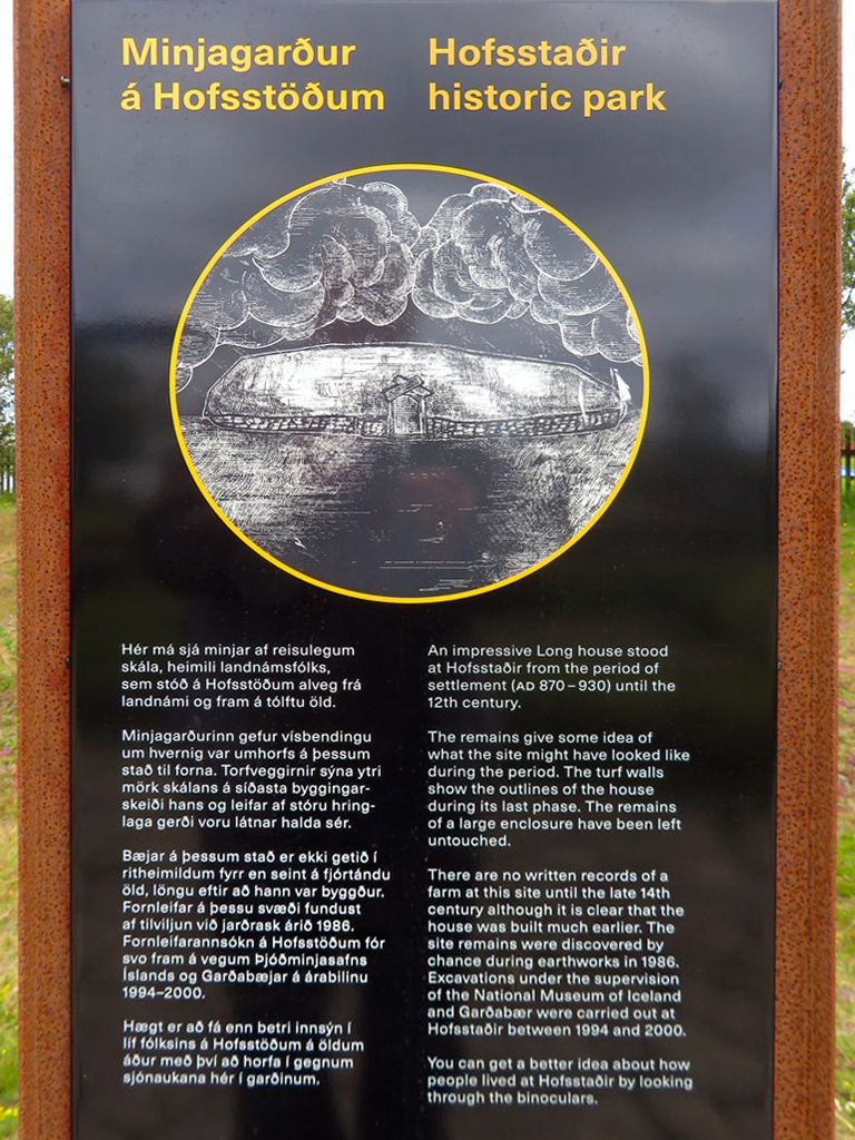 Hofsstaðir – upplýsingaskilti: S1 – seyðir, S2 – Hofsstaðir, S3 – Landnámsbærinn, S4 – Fólkið, S5 – Gripir og S6 – Vefstaðurinn.