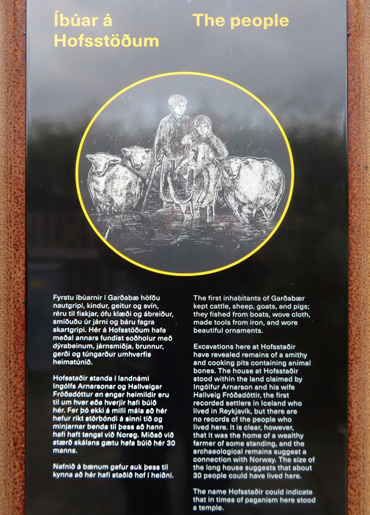Í Fógetagarðinum í miðbæ Reykjavíkur er skilti um „Landnám – Reykjavík„. Á því má lesa eftirfarandi fróðleik: