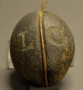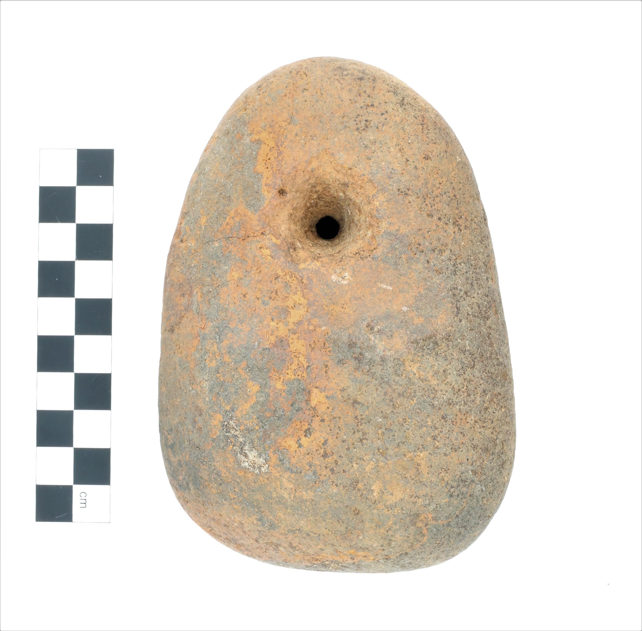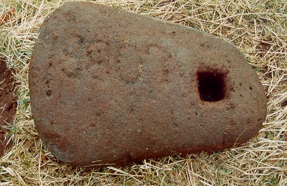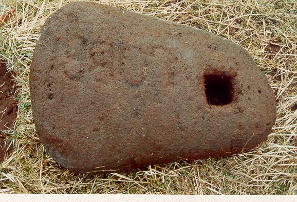 Gat var borað til að binda þráð í, en stundum er gatið af náttúrunnar hendi eða náttúrulegt gat sem var lagað til.