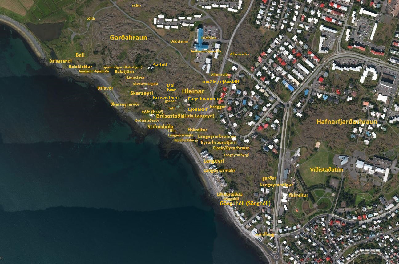 Og nú er komið að sögu Víðistaða. Þar var eyja áður, og á henni hóll ekki ómyndarlegur. Þegar eimyrjan lagði undir sig leirur, hólma og sker, og fyllti fjarðarbotninn úfinni steinstorku, veitti hóllinn á hólmanum viðnám, svo að kúfurinn stóð upp úr. Seinna fauk jarðvegur að hraunbrúninni, en kollurinn lækkaði. — Þannig varð hraunlausa vinin til.