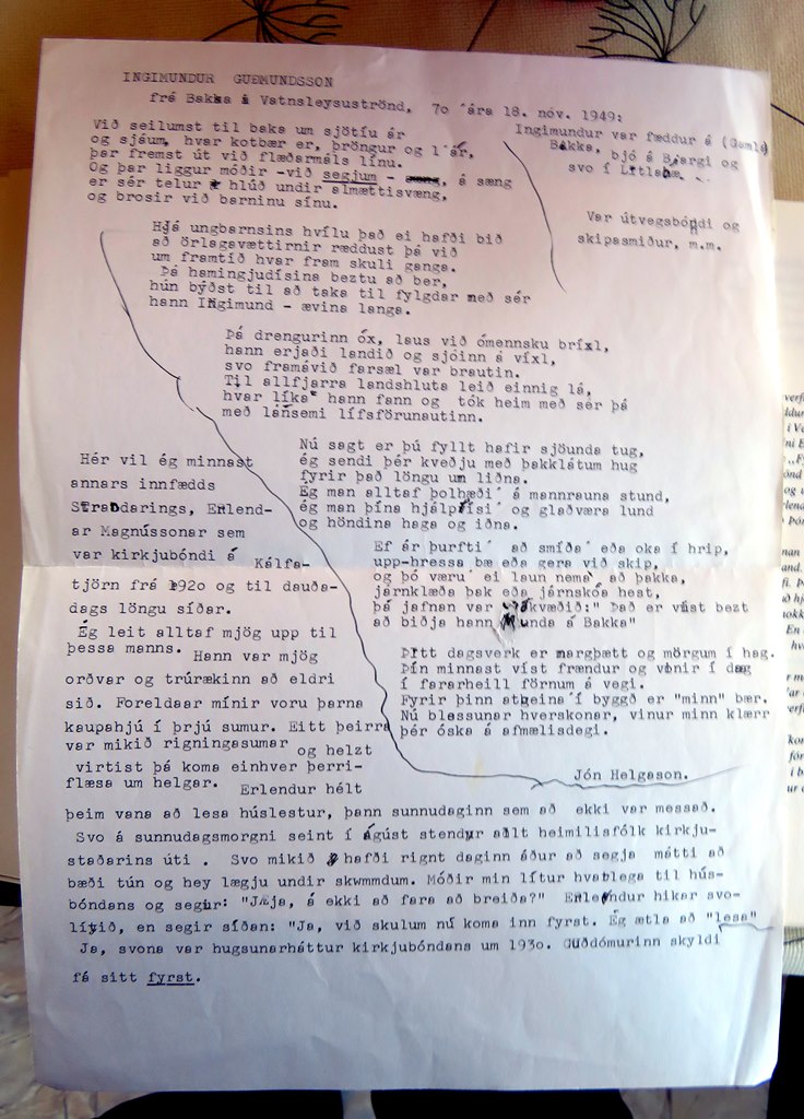 „Einu sinni vissi ég til þess, að ung hjón sem að segja mátti að væru á götunni, fóru suður í Voga í Vatnsleysustrandarhreppi til þess að líta á laust húsnæði sem þau töldu sig hafa séð auglýst í blaðaauglýsingu. Þetta var algjör misskilningur, því að átt var við húsnæði í Vogahverfinu í Reykjavík. En í blöðunum sá ég að auglýst var eftir kennara við StóruVoga-skóla og svo alveg sömu villuna að hnýtt var aftan við … á Vatnsleysuströnd. En þetta byggðarlag, Vogarnir, er bara alls ekki á neinu, hvorki á Vatnsleysuströnd né annars staðar, en auðvitað er staðreynd að þeir eru í Vatnsleysustrandarhreppi.